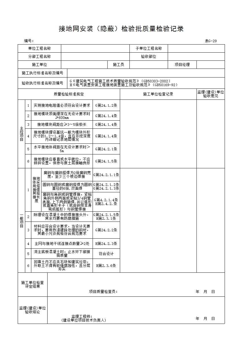 表G-29 接地网安装(隐蔽)检验批质量检验记录
