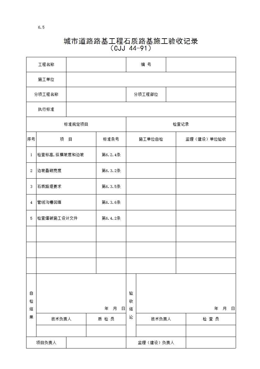 表格名称:6.5 城市道路路基工程石质路基施工验收记录