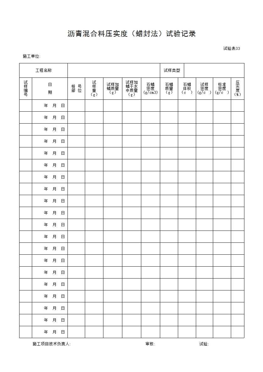 表格名称:试验表33 沥青混合料压实度(蜡封法)试验记录