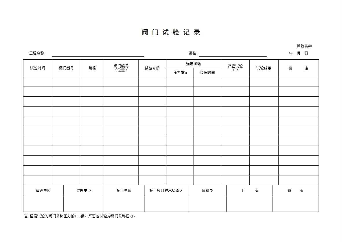 试验表48 阀门试验记录