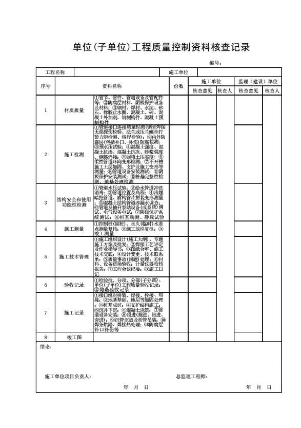 表格名称:单位(子单位)工程质量控制资料核查记录