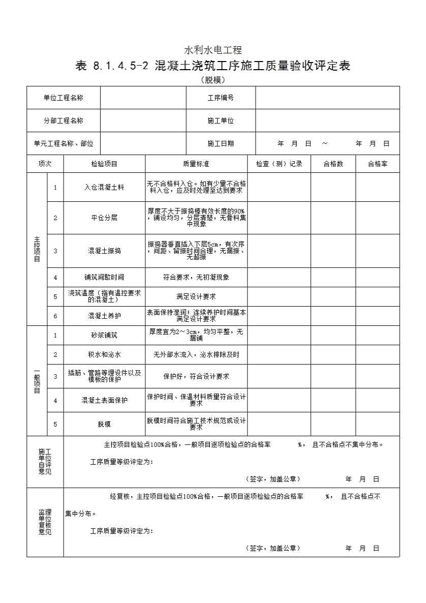 表格名称:表 8.1.4.5-2 混凝土浇筑工序施工质量验收评定表