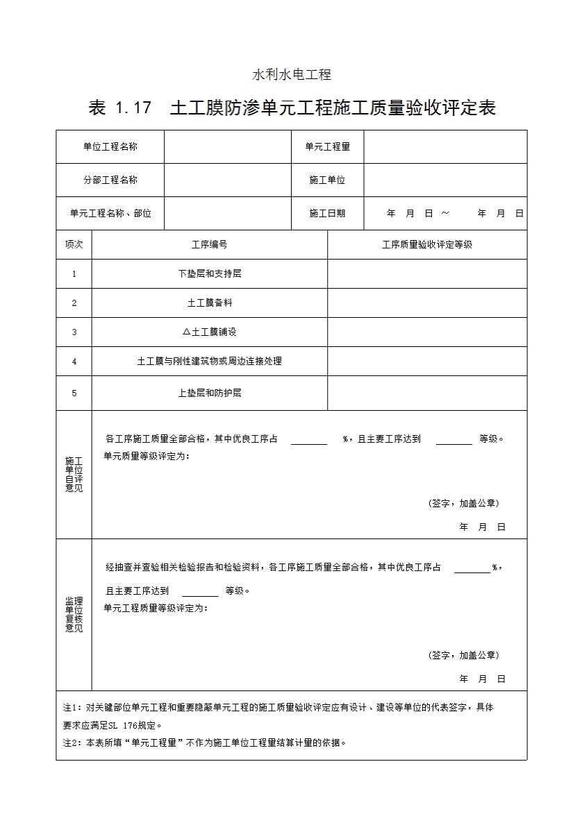 表1.17 土工膜防渗单元工程施工质量验收评定表