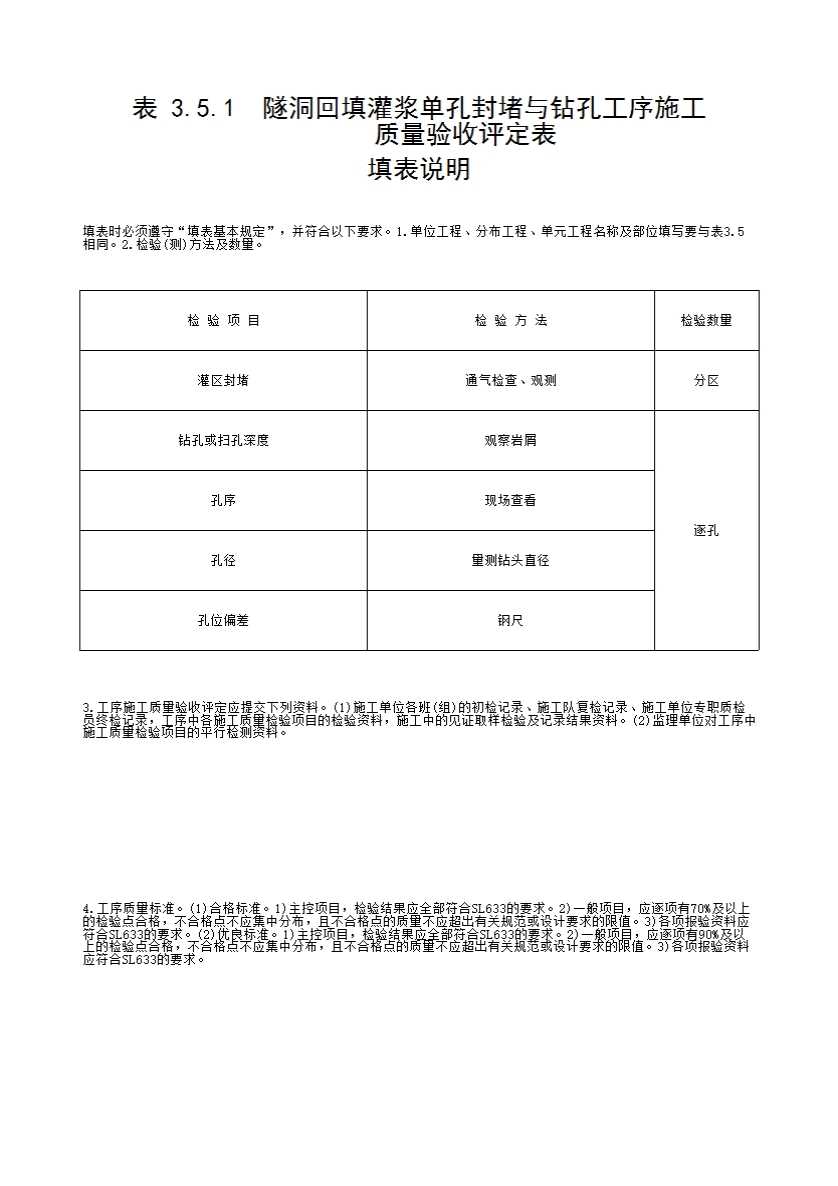 表 3.5.1 隧洞回填灌浆单孔封堵与钻孔工序施工质量验收评定表