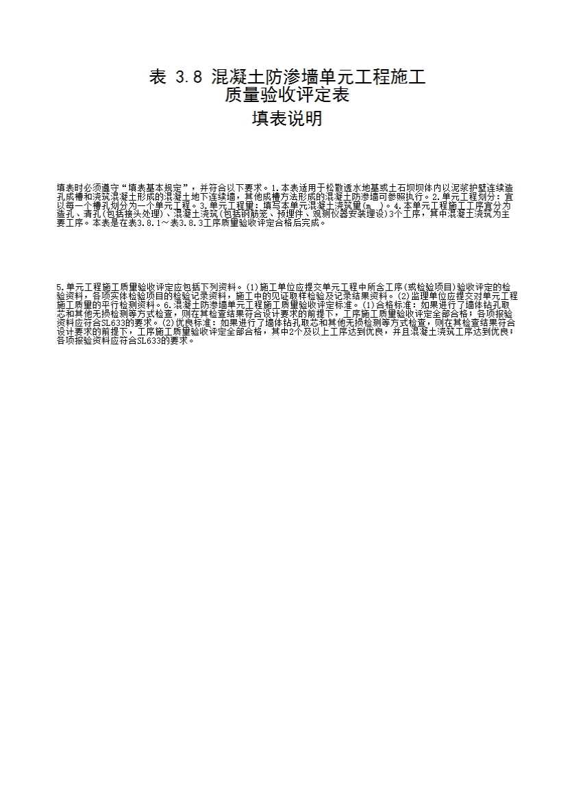 表格名称:表3.8 混凝土防渗墙单元工程施工质量验收评定表
