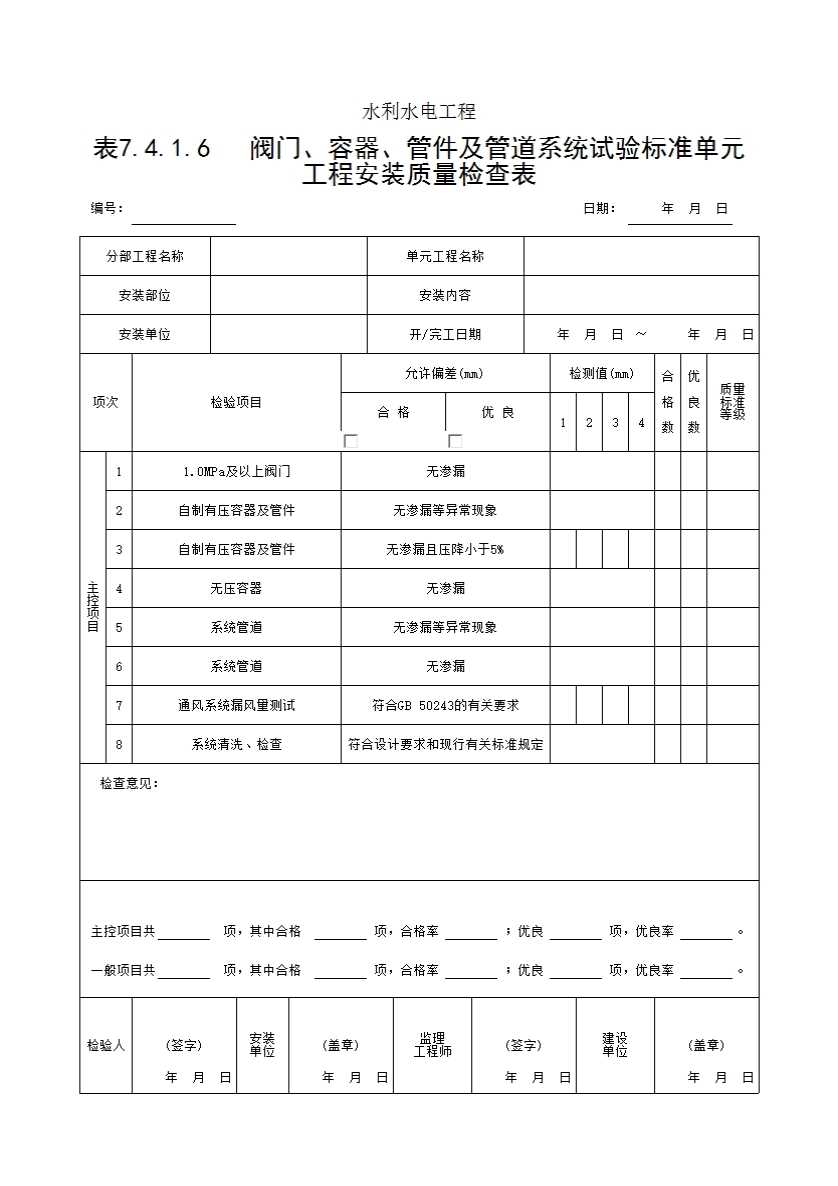 表格名称:表7.4.1.6 阀门、容器、管件及管道系统试验标准单元工程安装质量检查表