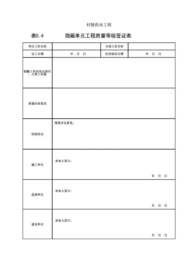 表0.4 隐蔽单元工程质量等级签证表