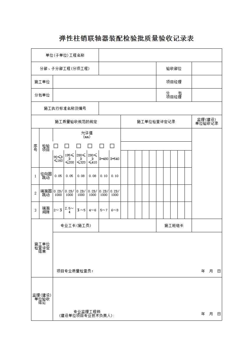 表格名称:弹性柱销联轴器装配检验批质量验收记录表