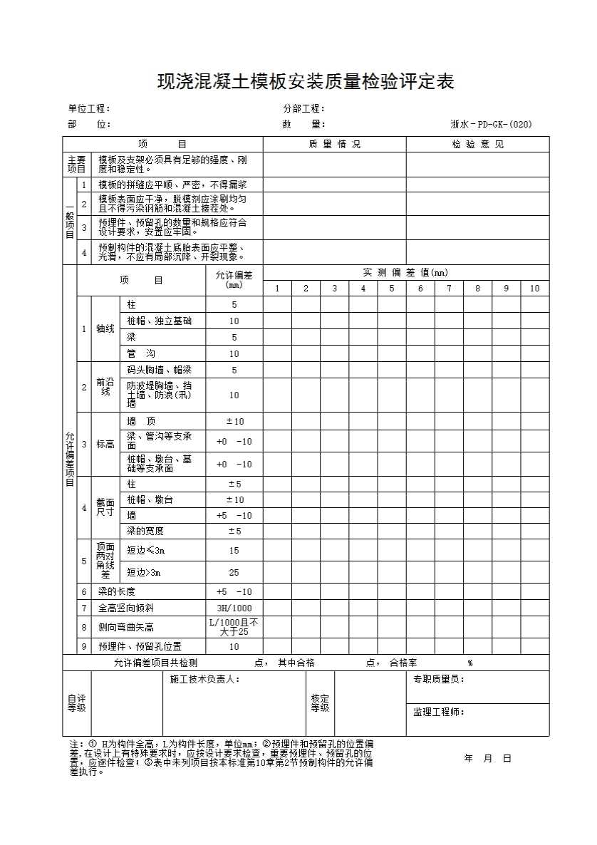 表格名称:020 现浇混凝土模板安装质量检验评定表