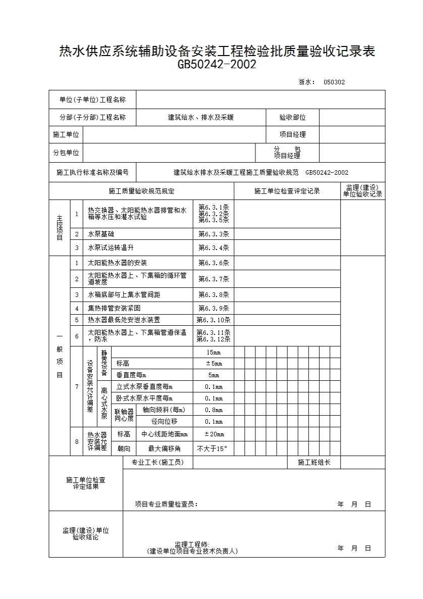 表格名称:166 热水供应系统辅助设备安装工程检验批质量验收记录表