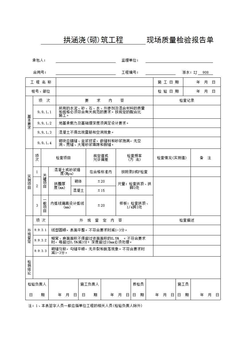 表格名称:浙水:ZJ908 拱涵浇(砌)筑工程现场质量检验报告单