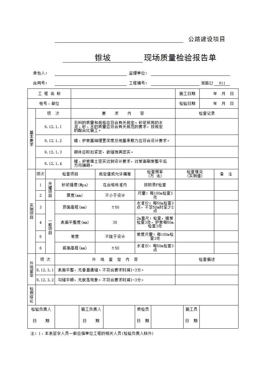 表格名称:浙路ZJ911 锥坡现场质量检验报告单