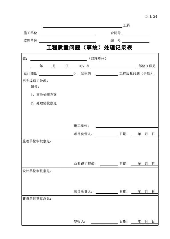 表格名称:D.1.24 工程质量问题(事故)处理记录表