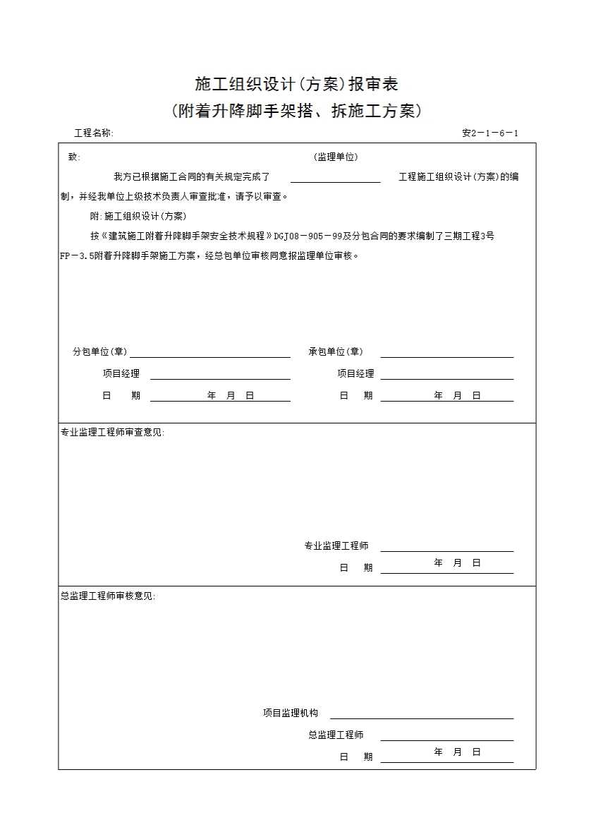 表格名称:施工组织设计(方案)报审表 (附着升降脚手架搭、拆施工方案) 安2—1—6—1