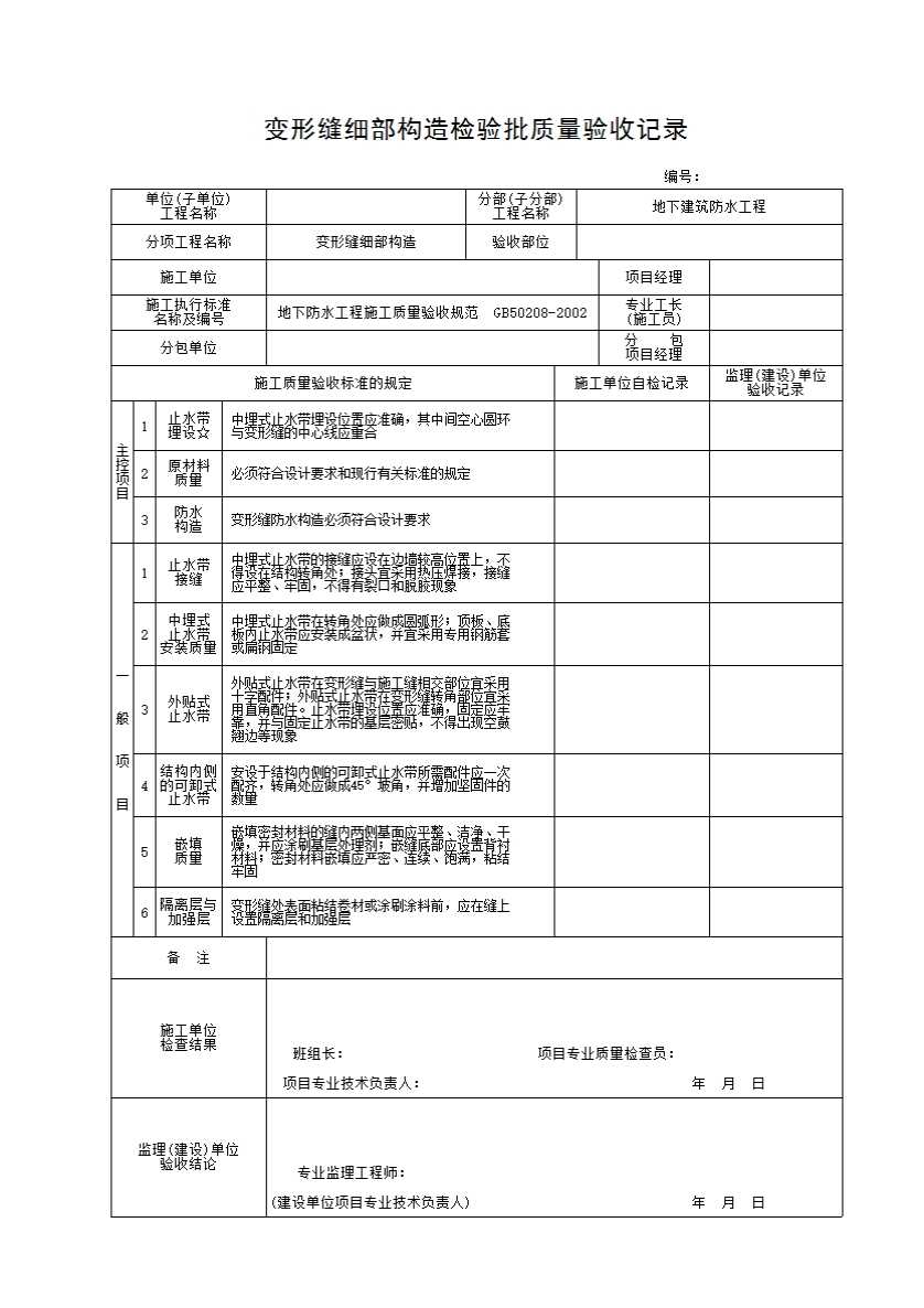 表格名称:变形缝细部构造检验批质量验收记录
