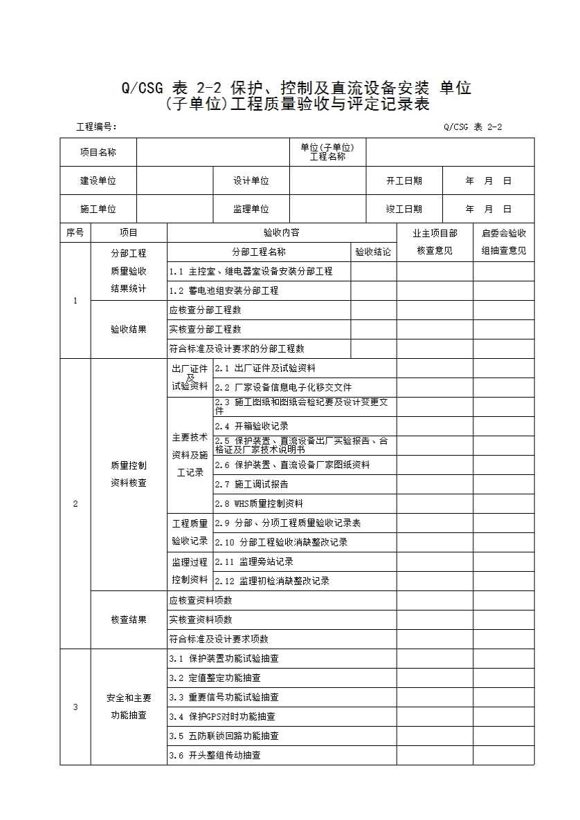 表格名称:QCSG 表 2-2 保护、控制及直流设备安装 单位(子单位)工程质量验收与评定记录表