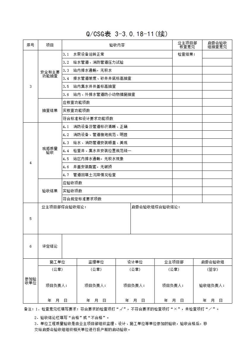 QCSG 表 3-3.0.18-11 站区给水、排水工程 单位(子单位)工程质量验收与评定记录表