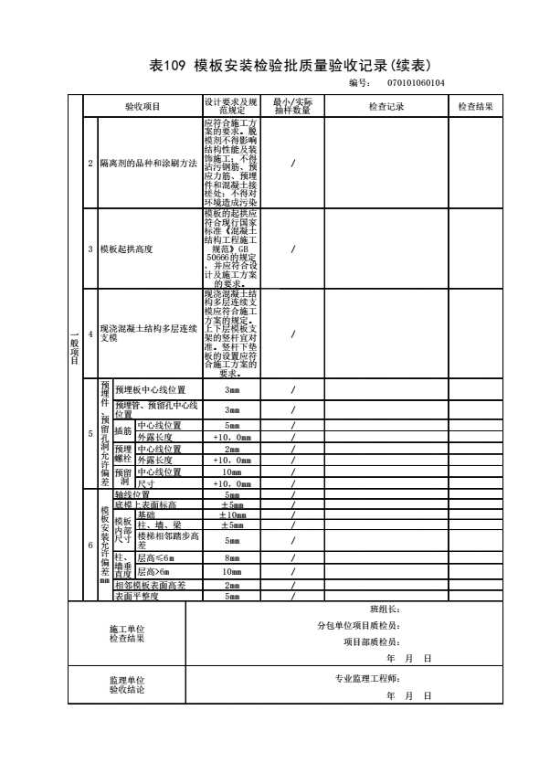 表格名称:070101060104 模板安装检验批质量验收记录