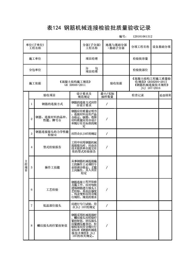 表格名称:120101061312 钢筋机械连接检验批质量验收记录