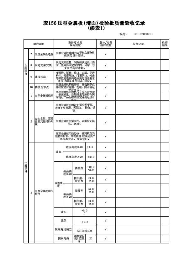 表格名称:120102030701 压型金属板(墙面)检验批质量验收记录