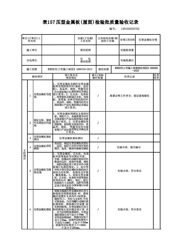 表格名称:120102030702 压型金属板(屋面)检验批质量验收记录
