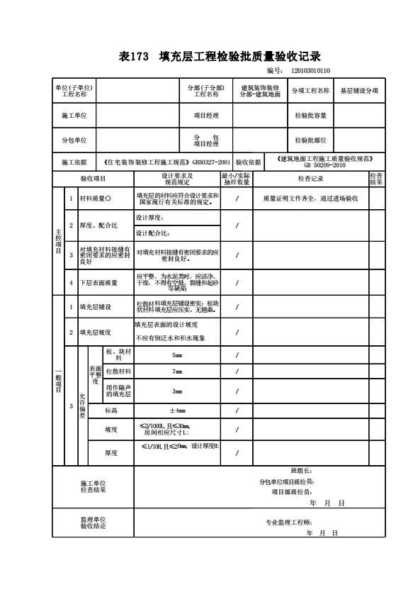 表格名称:120103010110 填充层工程检验批质量验收记录