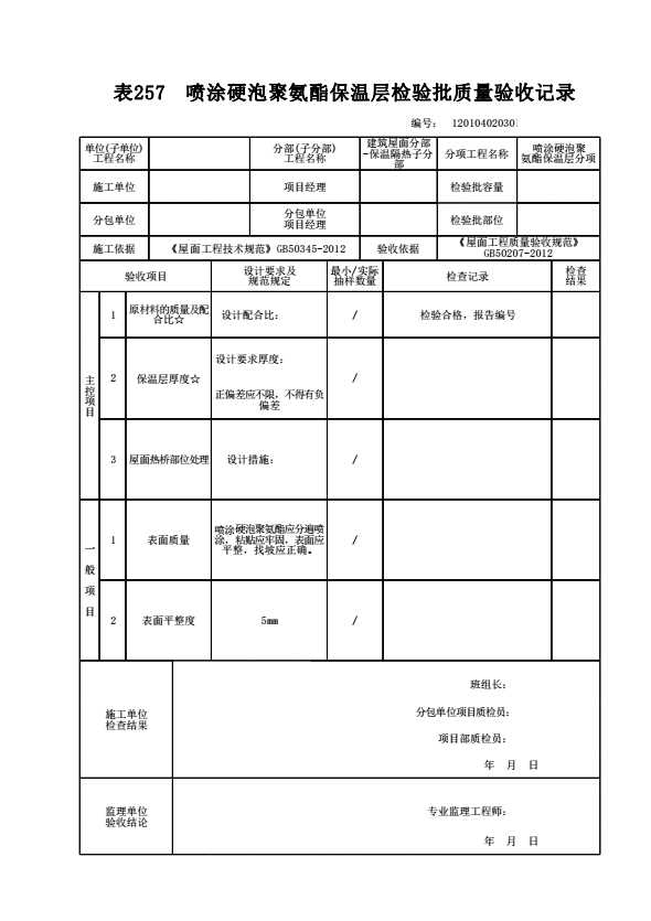表格名称:120104020301 喷涂硬泡聚氨酯保温层检验批质量验收记录