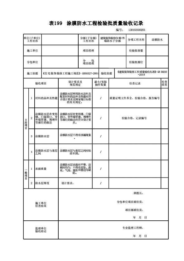 表格名称:130103030201 涂膜防水工程检验批质量验收记录