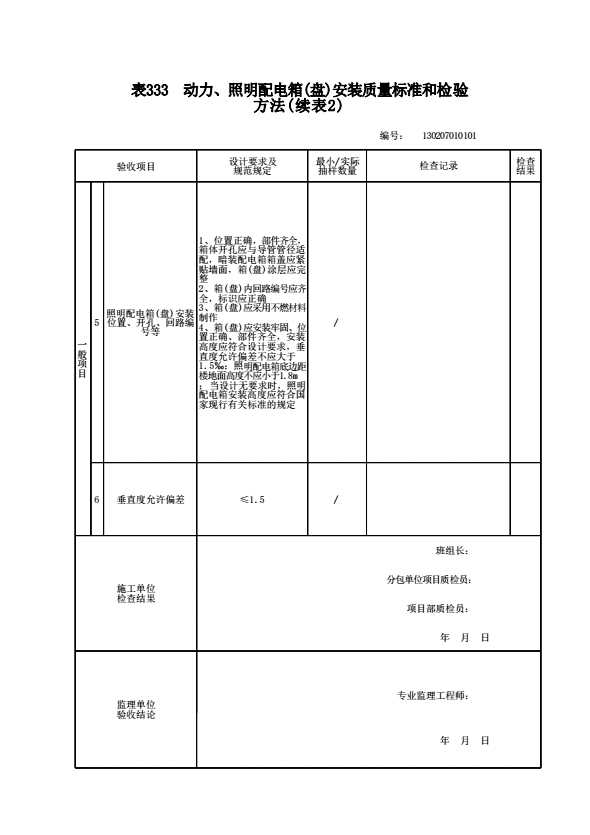 表格名称:130207010101 动力、照明配电箱(盘)安装质量标准和检验方法