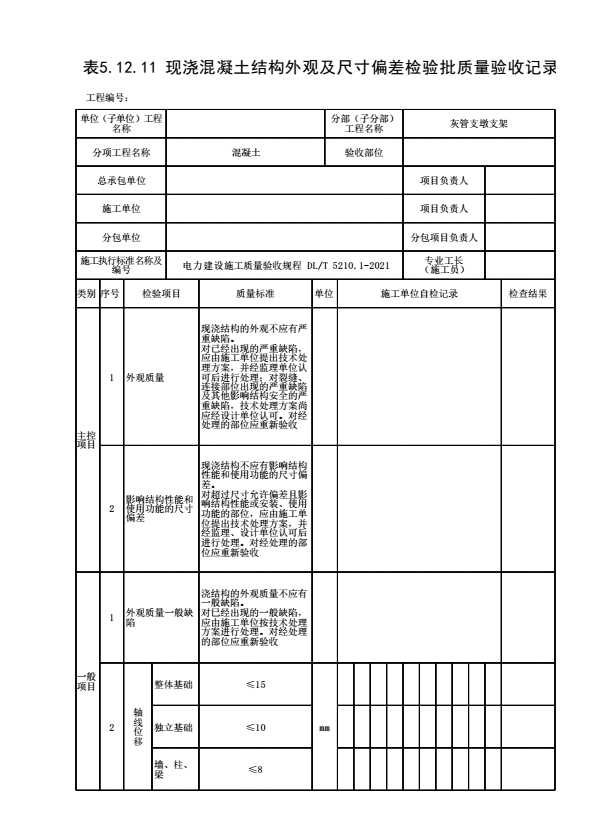 表格名称:[符合表5.12.11]表8.7.6混凝土结构外观及尺寸偏差检验批质量验收记录