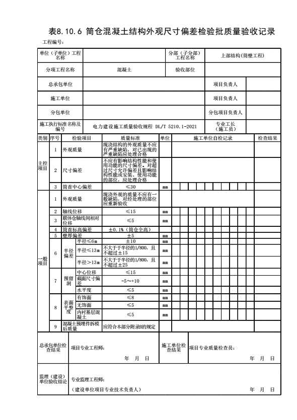 表8.10.6筒仓混凝土结构外观尺寸偏差检验批质里验收记录