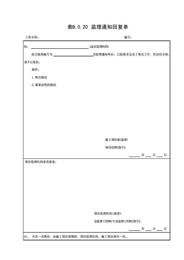 表B.0.20 监理通知回复单