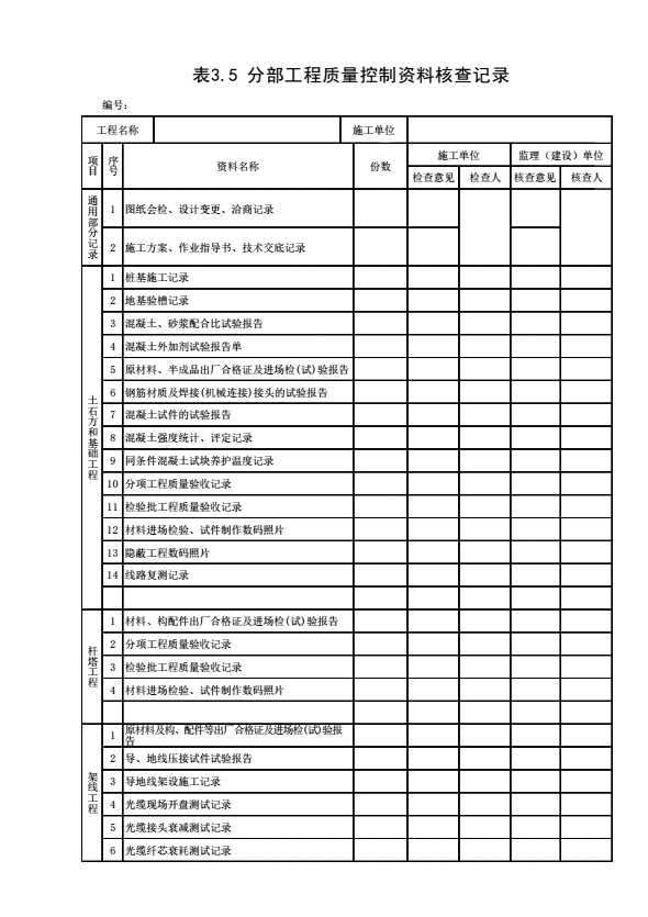 表格名称:表3.5 分部工程质量控制资料核查记录
