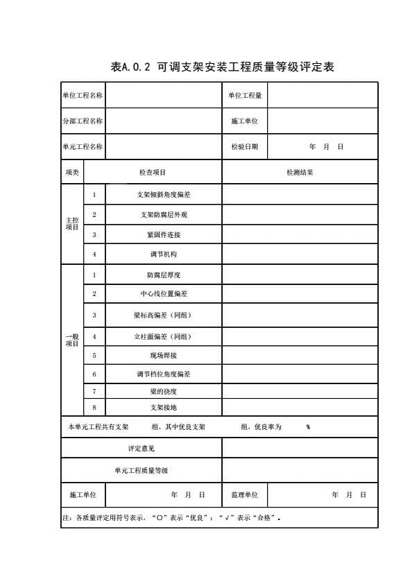 表格名称:表A.0.2 可调支架安装工程质量等级评定表