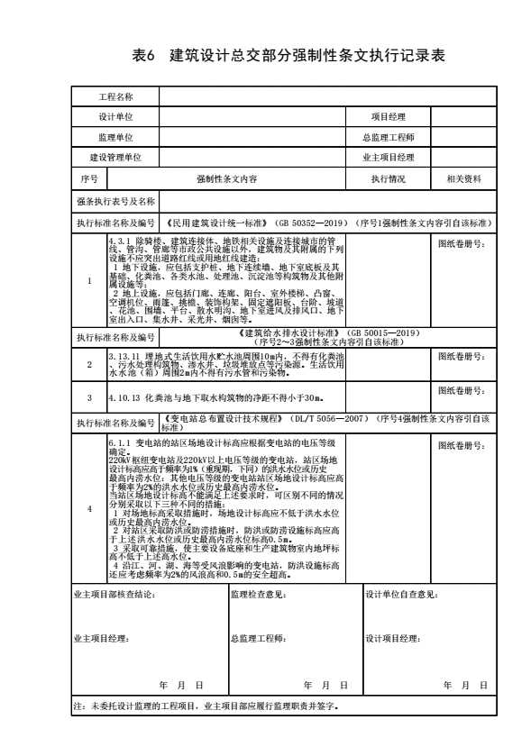 表格名称:表6 建筑设计总交部分强制性条文执行记录表
