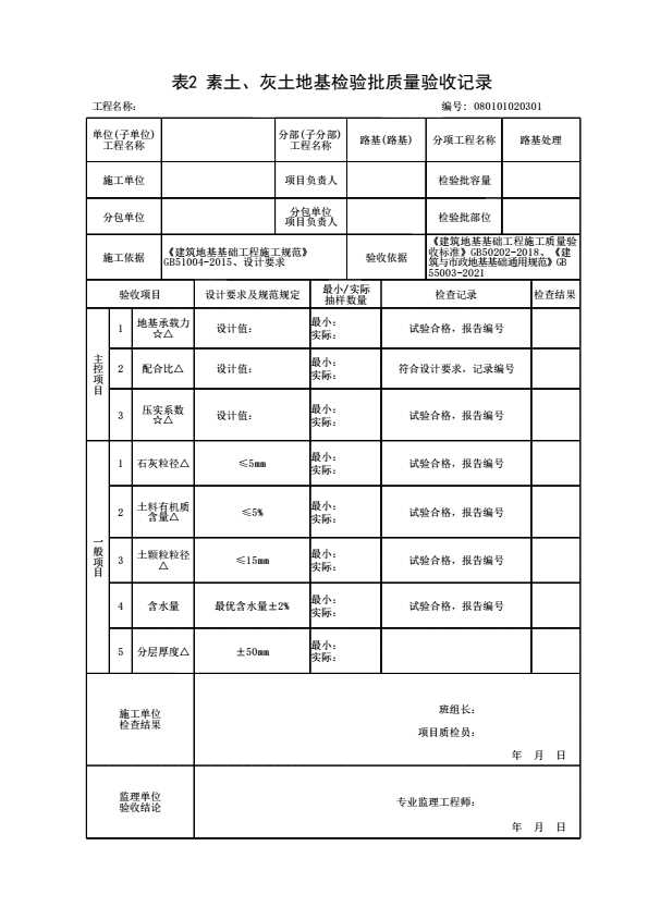 表格名称:080101020301 素土、灰土地基检验批质量验收记录