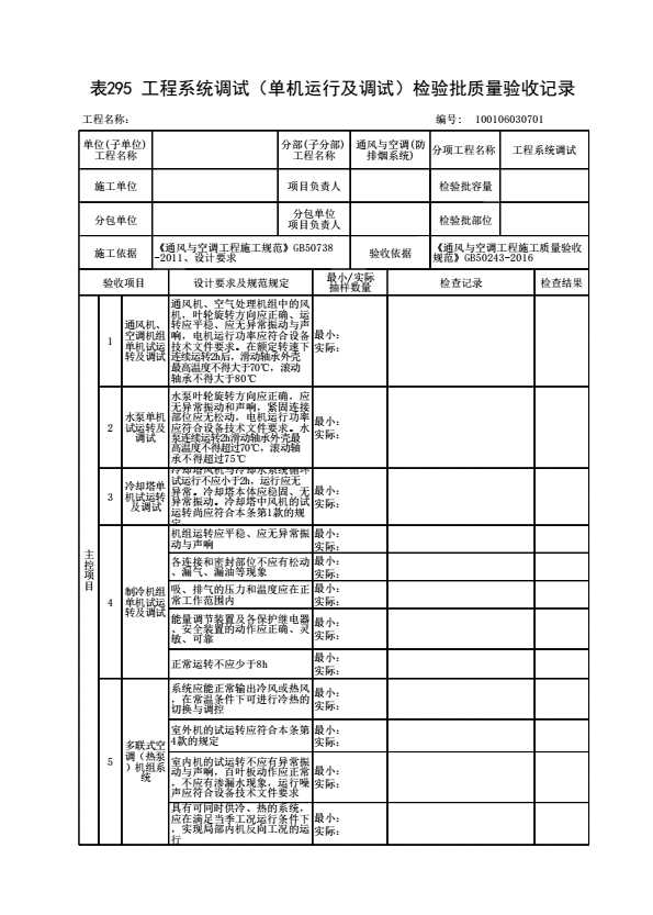 表格名称:100106030701 工程系统调试(单机运行及调试)检验批质量验收记录
