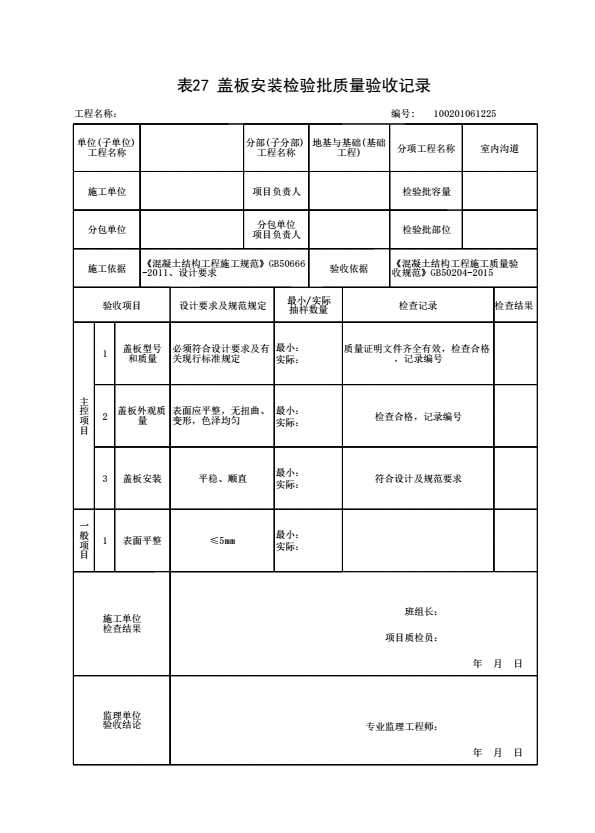 表格名称:100201061225 盖板安装检验批检验批质量验收记录