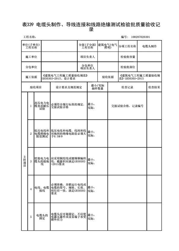 表格名称:100207020301 电缆头制作、导线连接和线路绝缘测试检验批质量验收记录