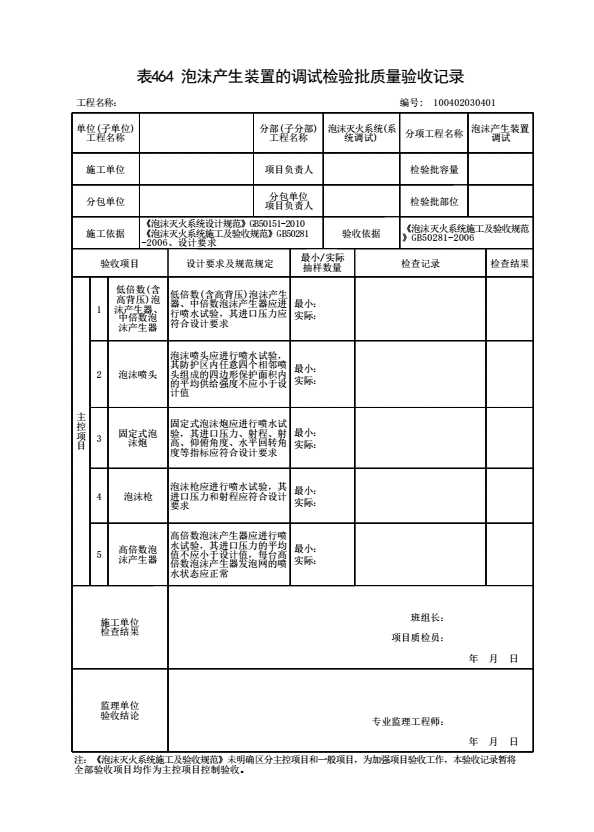 表格名称:100402030401 泡沫产生装置的调试检验批质量验收记录
