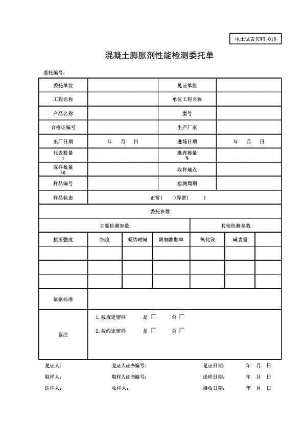表格名称:电土试表JCWT-018 混凝土膨胀剂性能检测委托单