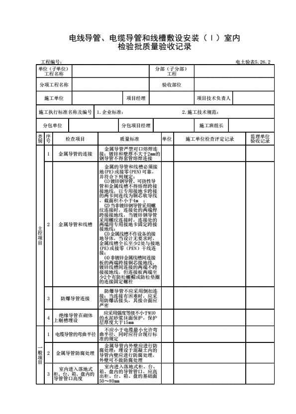 表格名称:电土验表5.26.2 电线导管、电缆导管和线槽敷设安装(I)室内检验批质量验收记录