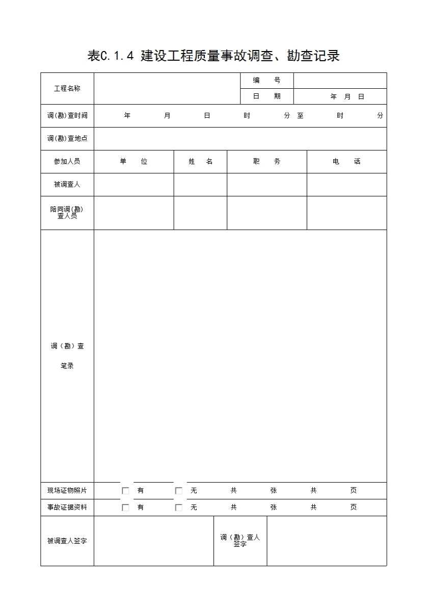 表格名称:表C.1.4 建设工程质量事故调查、勘查记录