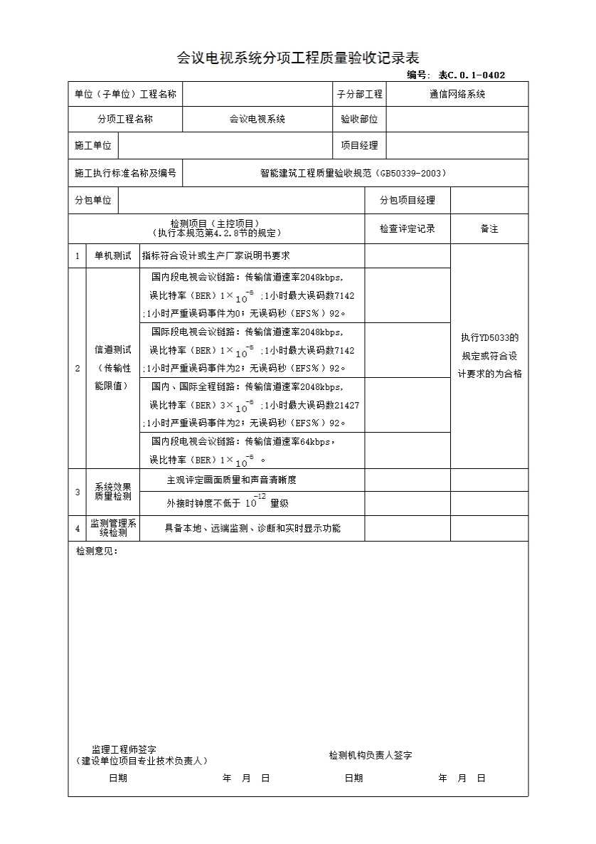 表格名称:C.0.1-0402 会议电视系统分项工程质量验收记录表