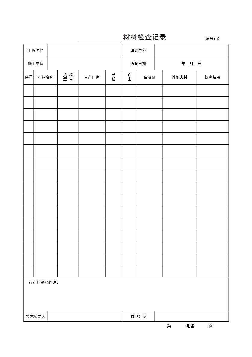 表格名称:_______材料检查记录