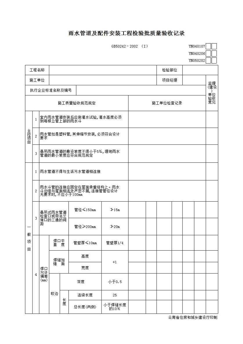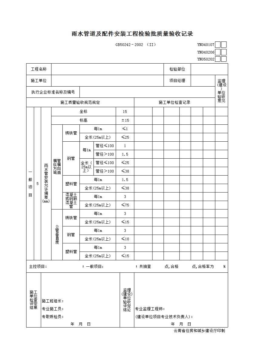 表格名称:雨水管道及配件安装工程检验批质量验收记录