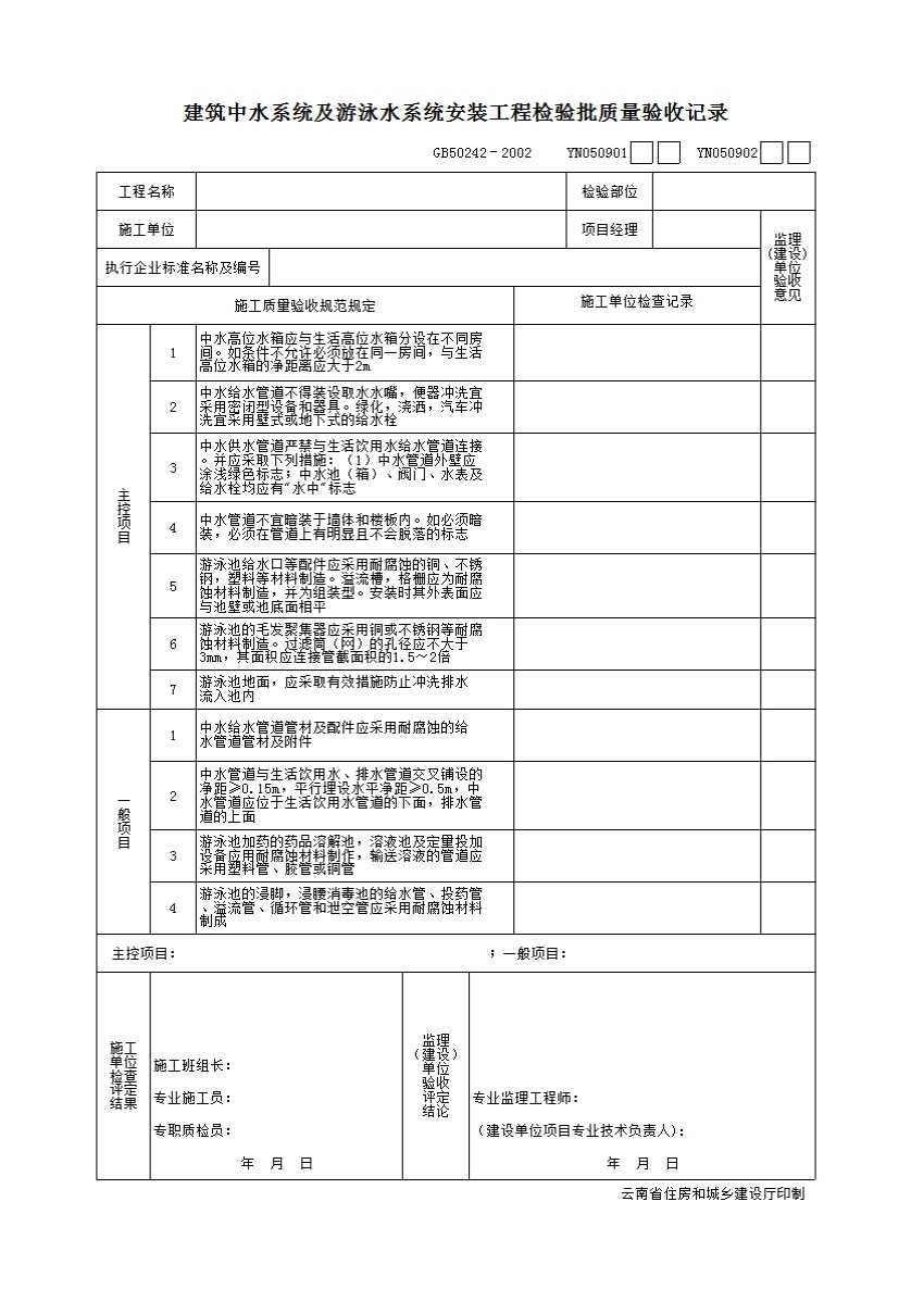 表格名称:筑中水系统及游泳水系统安装工程检验批质量验收记录