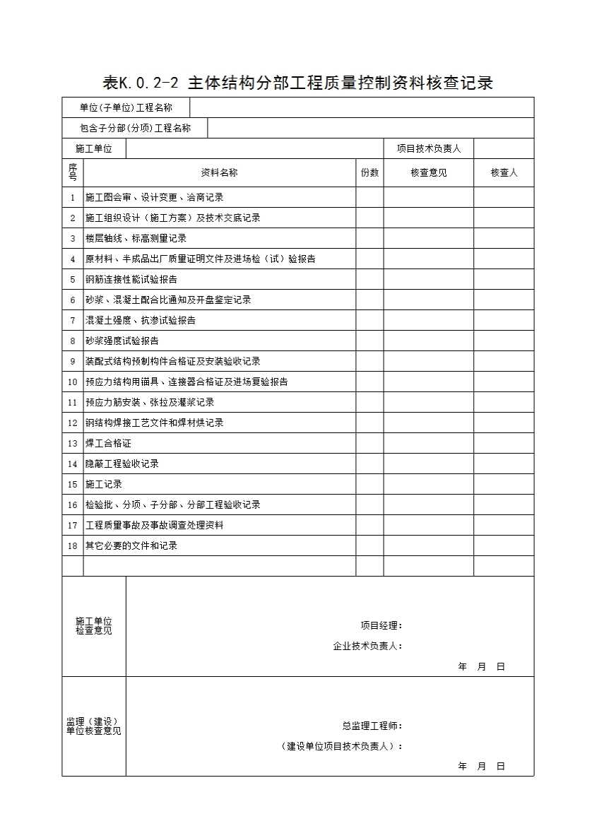 表格名称:表K.0.2-2 主体结构分部工程质量控制资料核查记录