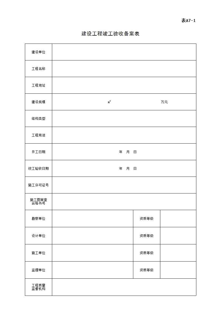表格名称:表A7-1 建设工程竣工验收备案表