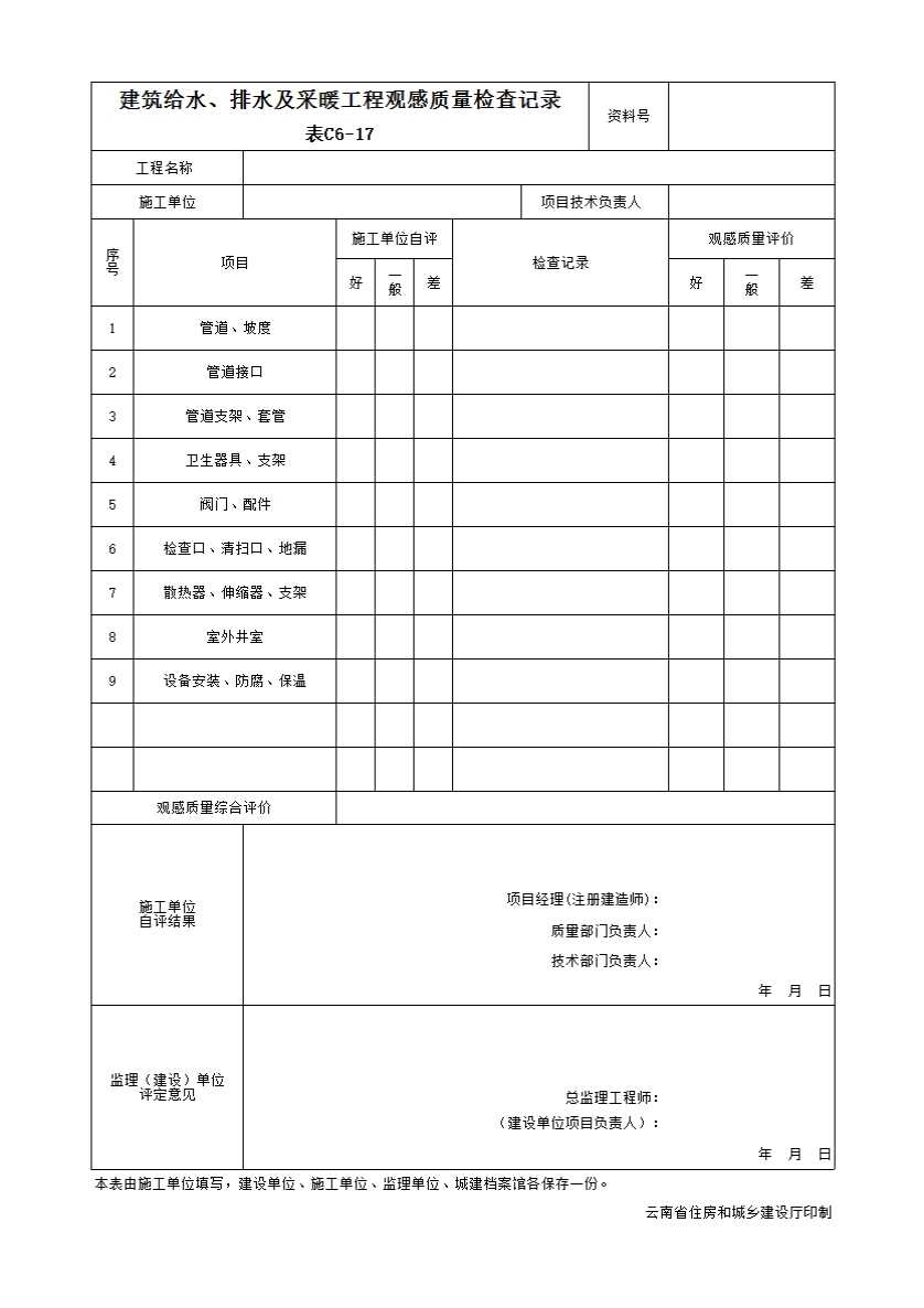 表格名称:表C6-17 建筑给水排水及采暖工程观感质量检查记录